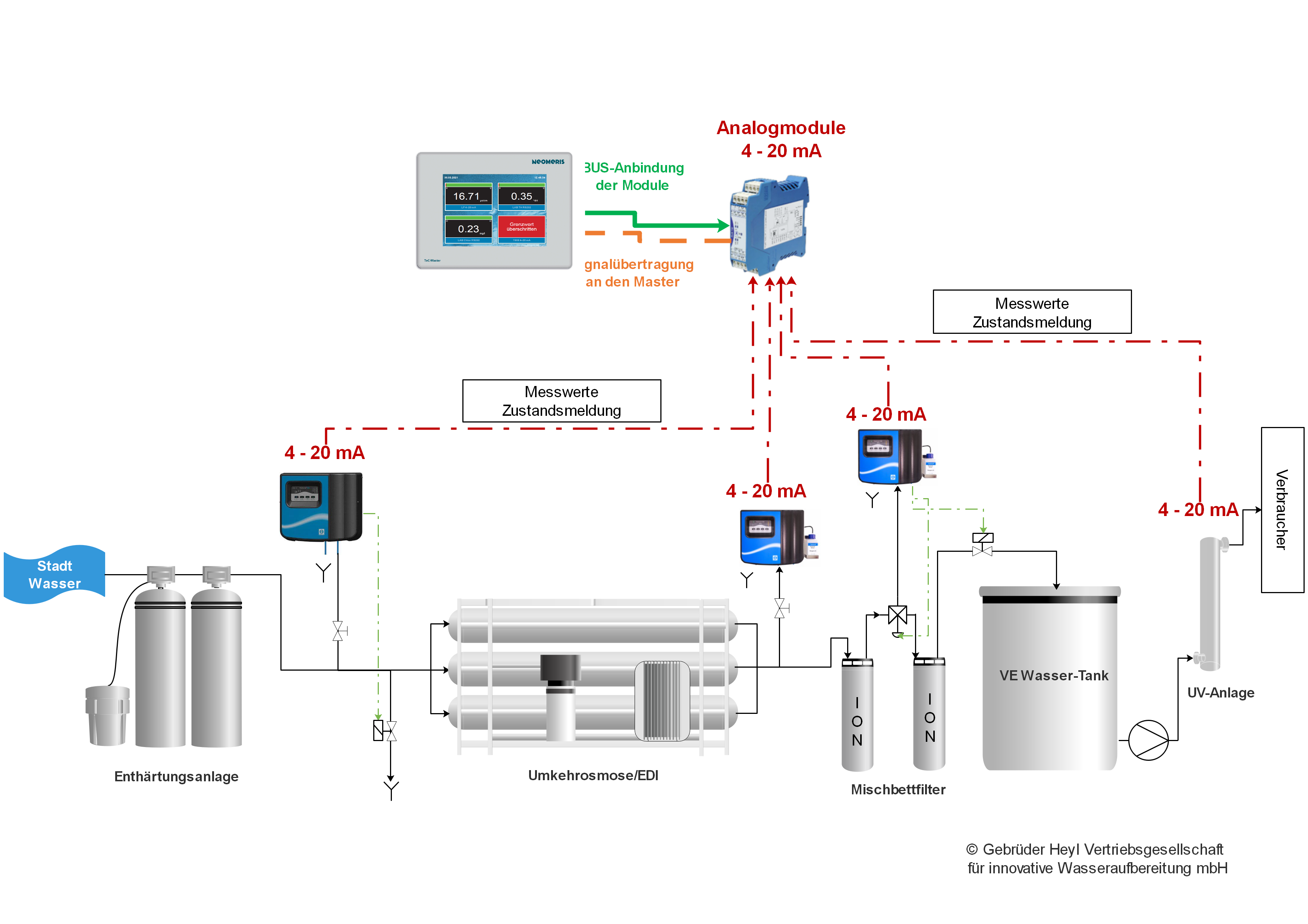The usually extensive spatial division of an AEMP and the strict separation of "unclean and clean side" suggests the visualization of the media and system status of the water treatment and the equipment technology. The monitoring technology should be suitable to ensure the data transfer to higher-level systems.